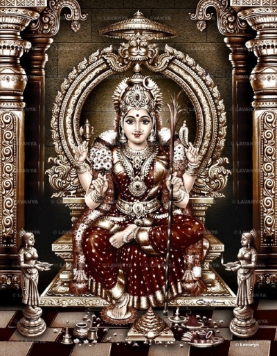Devi’s face, the auspicious home of Kaama (Cupid), has eyebrows that resemble archways leading to that abode of beauty. Her eyes move like fish in the streams of beauty flowing from Her face.