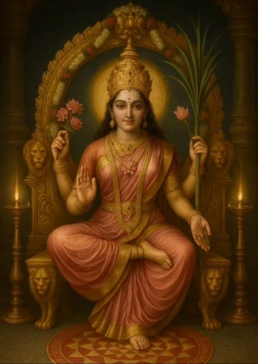 I meditate upon Śrī Lalitā, whose graceful thighs, soft as divine mercy, are cherished by Kāmēśvara alone, signifying a beauty that transcends form and enters the realm of sacred intimacy, and whose knees glow like twin ruby crowns, resplendent even in repose. May this hidden elegance teach me the depth of trust and the richness of inner closeness with the Divine, and may this still majesty awaken in me the understanding that divinity dwells not only in movement but also in stillness, and that humility too can wear a crown.