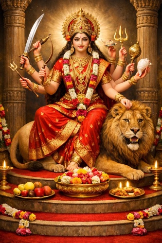 Meditation: “I bow to Mahā-catuḥ-ṣaṣṭi-koṭi-yoginī-gaṇa-sevitā, the Mother served by countless Yoginī powers, who grants strength to my body, health to my life, and divine protection on my path.”